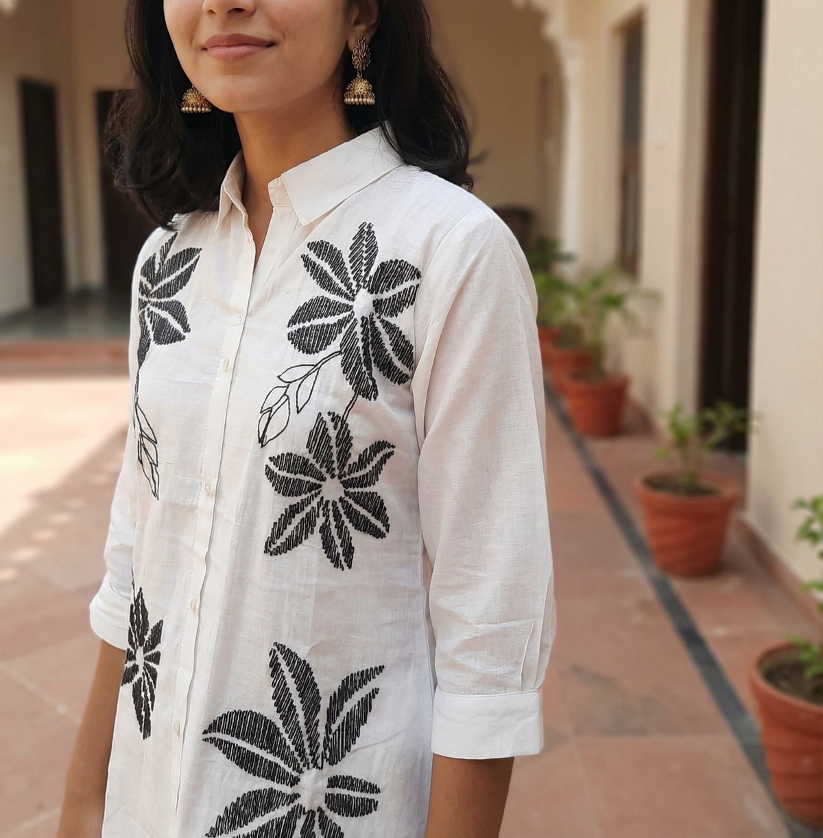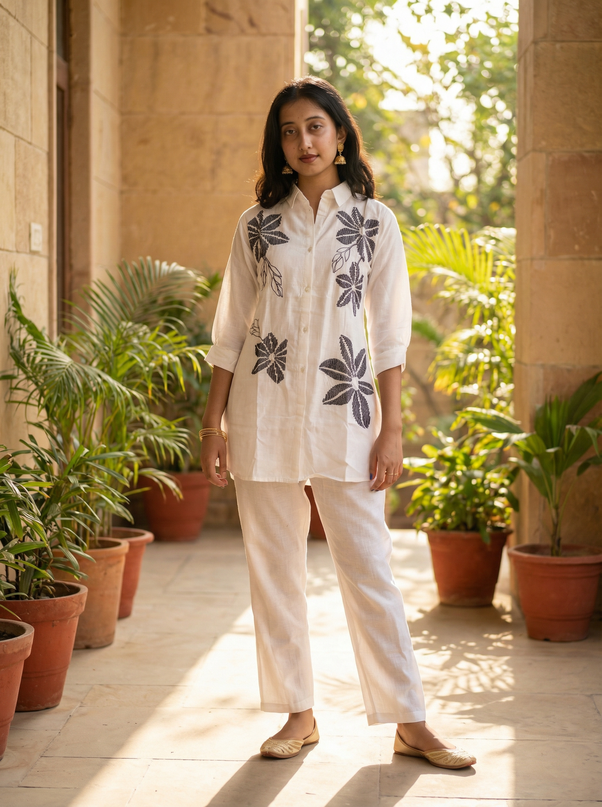 VATICAN SILK WHITE CORD SET WITH FLOWER EMBROIDERY - M